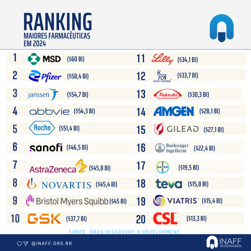 O levantamento foi realizado pelo portal Drug Discovery & Development, considerando o faturamento das farmacêuticas no último ano.