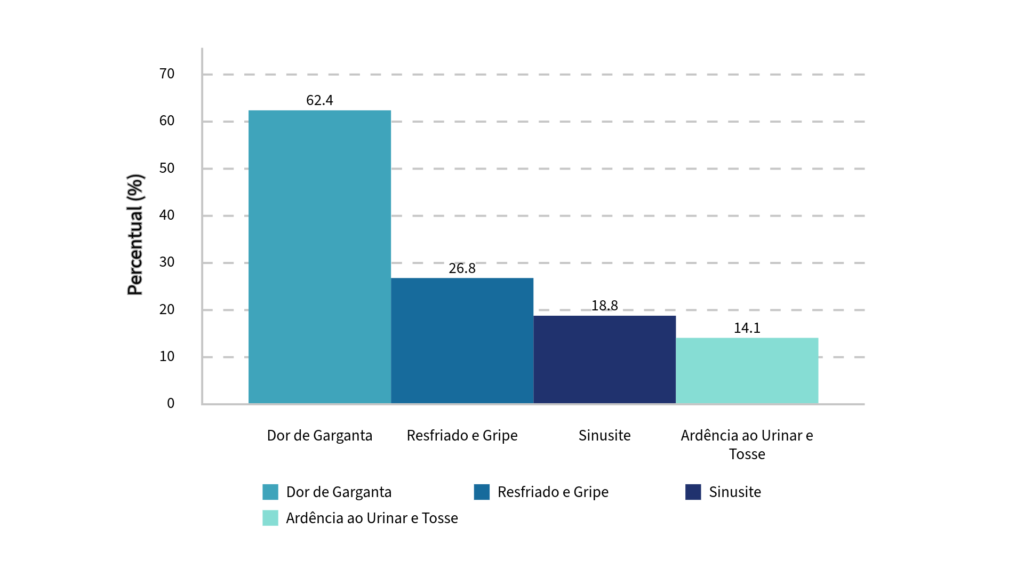 Dor de garganta é um dos motivos predominantes pelo qual as pessoas se automedicam (62,4%); em seguida estão Gripes e resfriados (26,8%); sinusite(18,8%); e ardência ao urinar e tosse (14,1%), são as principais razões para a automedicação.